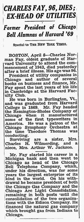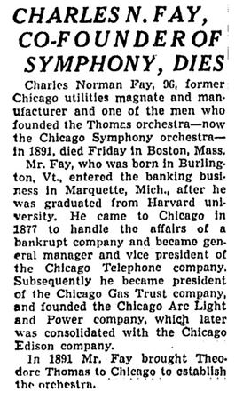 "To Theodore Thomas we must ascribe all honor as the founder of our Orchestra, but to Charles Norman Fay, a man endowed with a genius for organization and executive work, is due equal honor for the first thought of the Orchestra. . . . It was Mr. Fay who suggested to Mr. Thomas the formation of a permanent Orchestra in Chicago, and who provided the ways and means for his coming as its Conductor." — Philo Adams Otis, The Chicago Symphony Orchestra: Its Organization, Growth and Development, 1891–1924