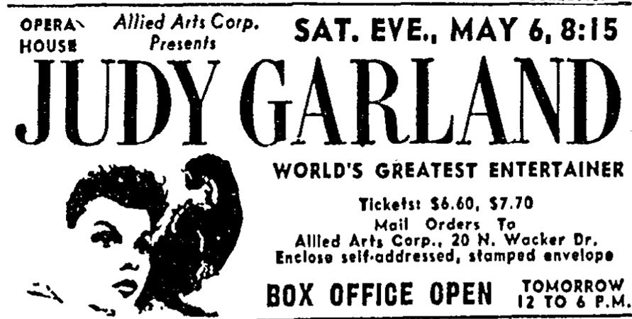 Under the auspices of Allied Arts, Garland was back in Chicago on two more occasions — both for performances at the new Arie Crown Theater at McCormick Place — on November 7, 1962, and May 7, 1965. “Audiences habitually regard her concerts as love feasts. This was no exception,” wrote Thomas Willis in the Chicago Tribune on November 8, 1962. “Through it all, the high-voltage personality operated full force.”