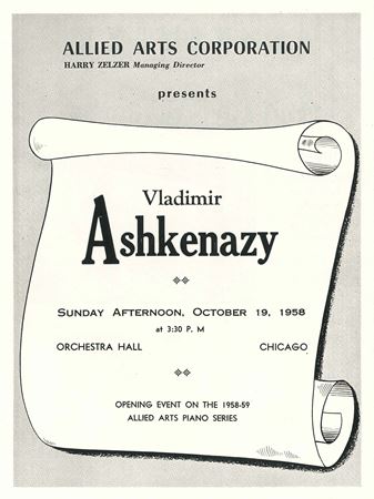 “Pound for pound, he may be the most pyrotechnic pianist in the whole world,” wrote Seymour Raven in the Chicago Tribune, following Ashkenazy’s Orchestra Hall recital debut, presented under the auspices of Allied Arts on October 19, 1958. Seven years later, after his Chicago Symphony Orchestra debut in Prokofiev’s Second Piano Concerto, Thomas Willis (also in the Tribune) commented, the “volcanic [pianist], whose two previous recitals here marked him as a man to watch, had everything it takes to get the locomotor going full speed and most of the qualities to sustain momentum. The big tone for melodies framed the structure in iron. The bravura technique took in stride the hammering octaves, scales which sweep the keyboard, and arpeggio lightning which galvanizes the Russian bear intermezzo into a furious climax. . . . This combination of work, soloist, and orchestra could lift you right out of your seat more than once.”