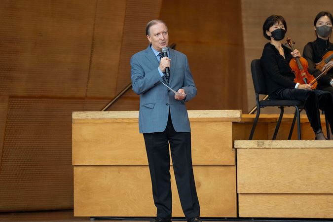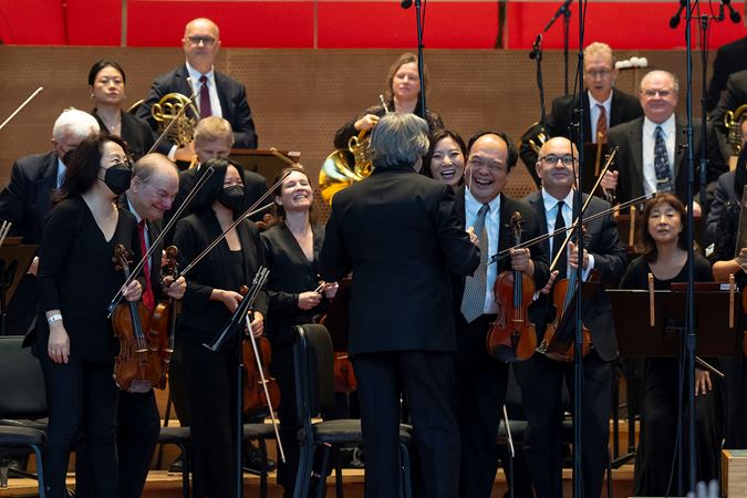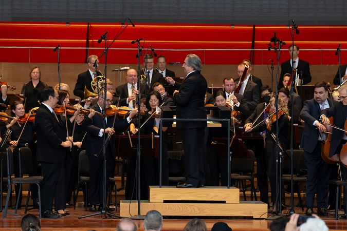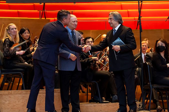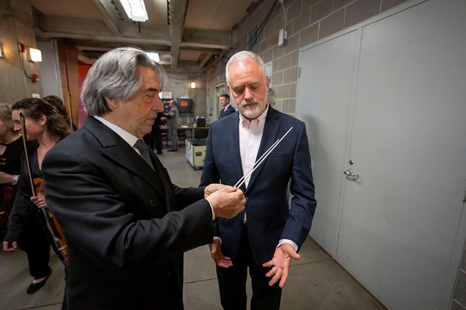Following the bittersweet program, Maestro Muti was recognized for his contributions to the city of Chicago during his 13-season tenure with the CSO. 34th Ward Alderman Bill Conway made an appearance on stage and read an honorary resolution on behalf of the city council and mayor, plus CSOA President Jeff Alexander and Board Chair Mary Louise Gorno presented Muti with the inaugural Charles Norman Fay Award for Distinguished Leadership. To conclude the evening, Muti handed over two batons — one from his final subscription concerts as music director and the other from Tuesday evening’s community concert — to the CSOA’s Rosenthal Archives to mark the closure of his chapter as 10th music director.