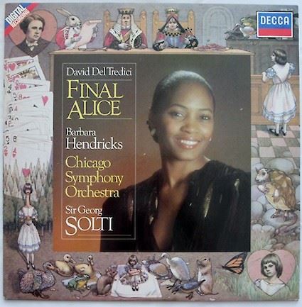 In Orchestra Hall on October 7, 8, and 9, 1976, eighth music director Sir Georg Solti led the Chicago Symphony Orchestra in the world premiere performances of Del Tredici’s Final Alice. 27-year-old Barbara Hendricks was the soprano soloist. The work was performed again on October 26 and 27, 1979, and recorded by London Records with sessions on October 27, 1979, and January 29 and 30, 1980. The recording was produced by James Mallinson; James Lock, John Dunkerley and Michael Mailes were the recording engineers.