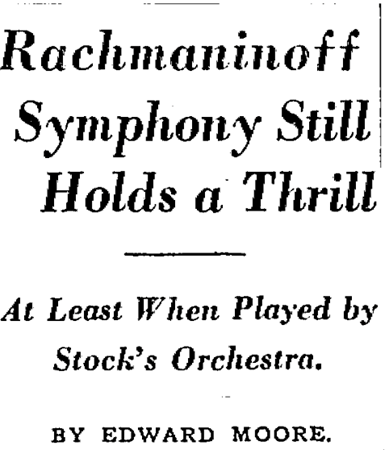 When the first phonograph recording of the Second Symphony was produced in 1934— by RCA Victor with the Minneapolis Symphony Orchestra under its music director Eugene Ormandy — Edward Moore of the Chicago Tribune quoted Stock on November 11, 1934, stating, “Where will we find another to write another Second Symphony.” Also in the Tribune, shortly after Rachmaninov’s passing, Cecil Smith mentioned on April 25, 1943, “I remember going backstage one time after Mr. Stock had conducted Rachmaninov’s Second Symphony, to find him still caught up in the personal exhilaration of the score invariably brought him, murmuring, ‘It’s a very beautiful work.’”