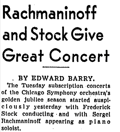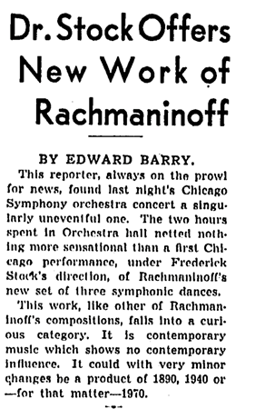 In the Tribune, Cecil Smith wrote on April 25, 1943, “It is perhaps inevitable that we should be unable to dissociate the names of Rachmaninov and Stock. Despite their different national backgrounds and points of origin, the two men seemed to share essentially the same musical horizon, and even their assumptions about what was good and proper and expressive rested upon a common agreement about the validity of rich, highly colored, deeply emotionalized music in the late Romantic period”.