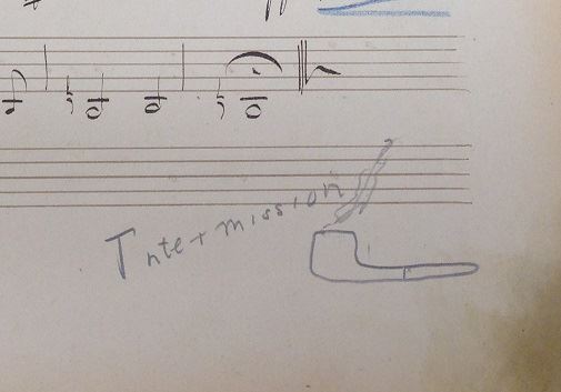 This set of manuscript parts was most likely used for the Chicago Symphony Orchestra’s first documented performance of the Requiem given at Northwestern University Gymnasium on June 4, 1910, as part of the annual North Shore Festival, as well as numerous subsequent occasions, including the first performance at the Ravinia Festival in 1951 and the first subscription concerts at Orchestra Hall in 1952. One of those annotations confirms this: when details for this set of parts was being entered into the Rosenthal Archives’ database, the cataloger indicated: “squashed bug removed from 3rd trombone part, noted as killed at Ravinia, 1951.” Also, the first trumpet illustrated his preferred intermission activity at the end of the “Dies irae”: a smoking pipe.