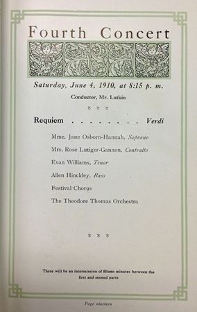 There is no evidence that Theodore Thomas, our founder and first music director, conducted Verdi’s Requiem with the Chicago Orchestra. Prior to the Orchestra’s founding in 1891, there is documentation that he first led the Requiem on May 1, 1884, with his eponymous ensemble — the Theodore Thomas Orchestra — and the Oratorio Society of Baltimore, given at the Fifth Regiment Armory in Baltimore, Maryland. His last known performance of the work was on May 24, 1890, at the Cincinnati May Festival, which he had founded in 1873.