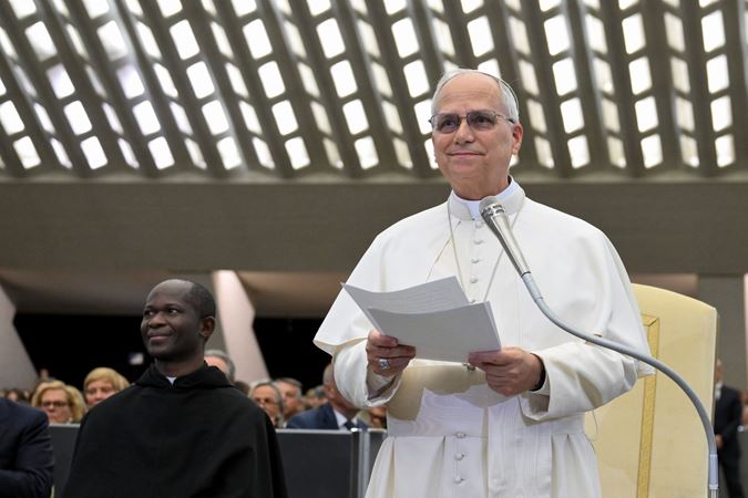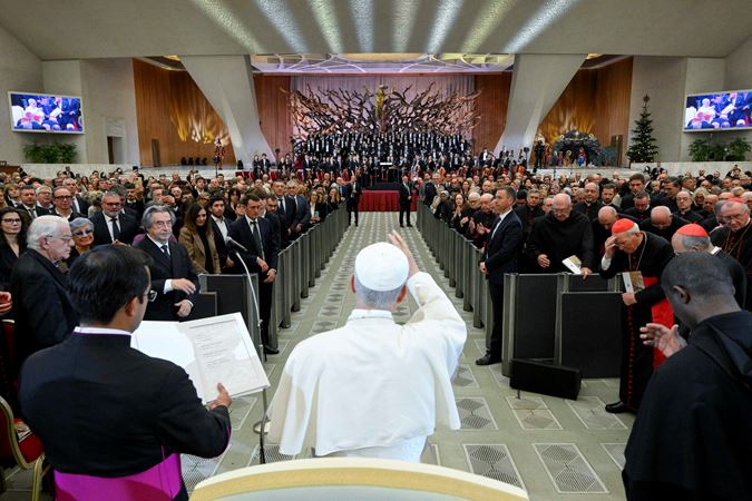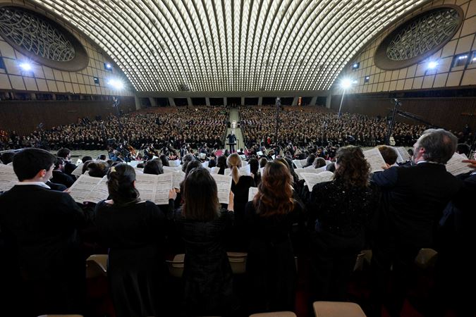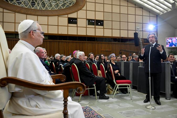 Pope Leo XIV joins other audience members for the Christmas concert conducted by Riccardo Muti as part of a special program that also included Muti’s receipt of the prestigious 2025 Ratzinger Prize, Dec. 12, 2025.