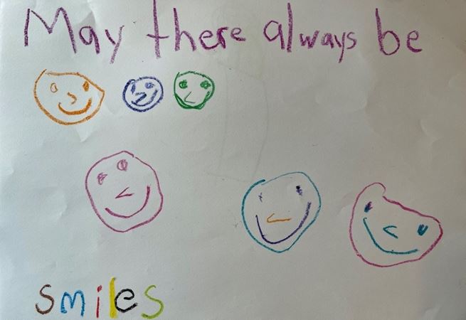 Rachel Milstein, a first-grade teacher at Liberty School in Cicero, collaborated with the school’s art teacher on the project and encouraged other teachers to join in with their classes. “When I showed the ’May There Always Be Sunshine’ video to my class, they really enjoyed it,” Milstein says. A colleague who teaches second grade added that the “kids were really excited to participate.”