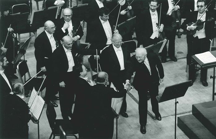 Karel Husa greets Concertmaster Rubén González following the world premiere of the composer's Concerto for Trumpet and Orchestra on February 11, 1988