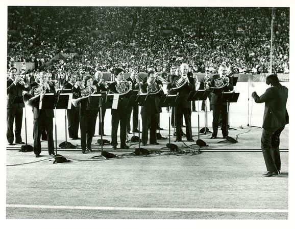 Associate Conductor Kenneth Jean leads the CSO brass section in The National Anthem at Soldier Field on September 14, 1987, for the Chicago Bears' home opening game