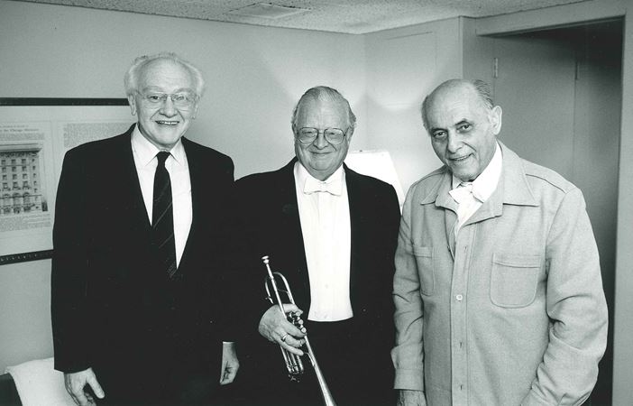 Karel Husa, Adolph Herseth and Sir Georg Solti backstage following the world premiere of the composer's Concerto for Trumpet and Orchestra on February 11, 1988