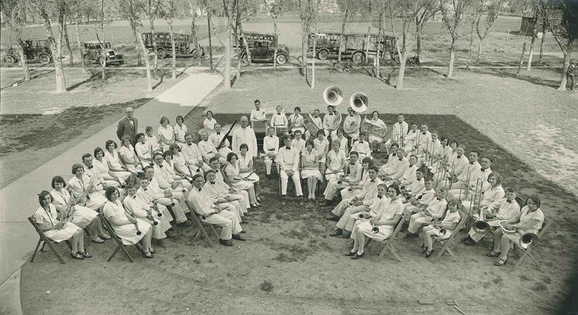 The school band in Bertha, Minnesota in 1929 (Adolph Herseth is pictured near the far right of the second row, second from the end)