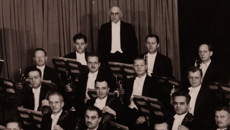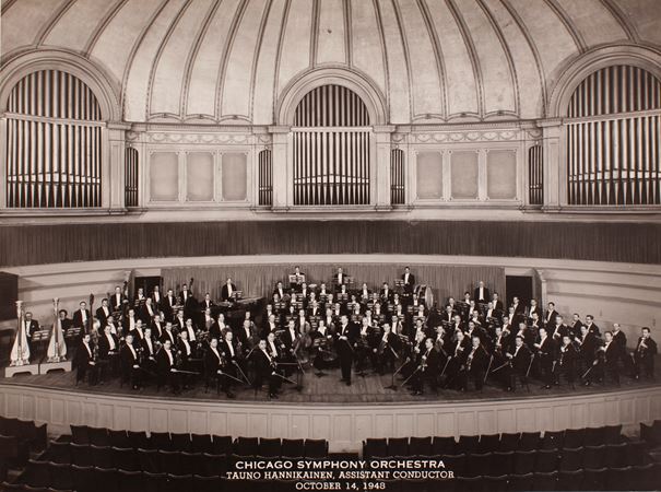 The Chicago Symphony Orchestra and Assistant Conductor Tauno Hannikainen onstage in Orchestra Hall on October 14, 1948, at the beginning of Adolph Herseth's first downtown season as principal trumpet