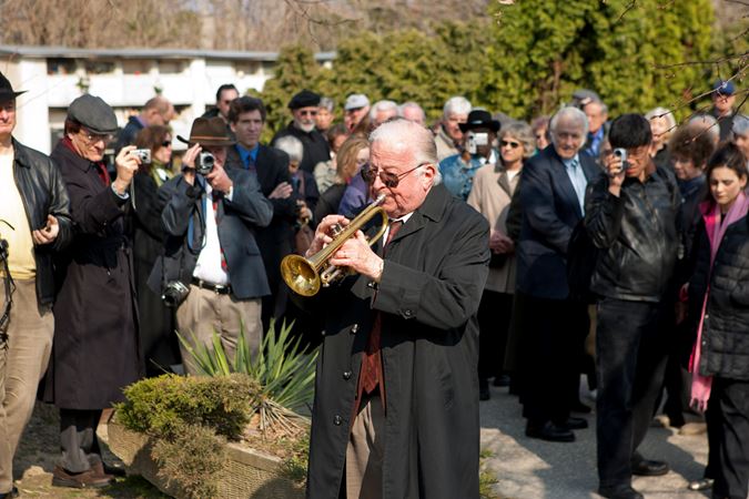 Adolph Herseth performs Taps at the gravesite of Sir Georg Solti in Budapest, Hungary on April 1, 2005