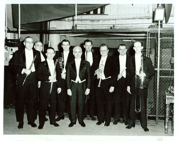 Clark Brody, Willard Elliot, Donald Peck, Dale Clevenger, Jean Martinon, Ray Still, Adolph Herseth, Donald Koss and Jay Friedman backstage before a performance of Martin’s Concerto for Seven Wind Instruments, Timpani, Percussion, and String Orchestra in February 1966