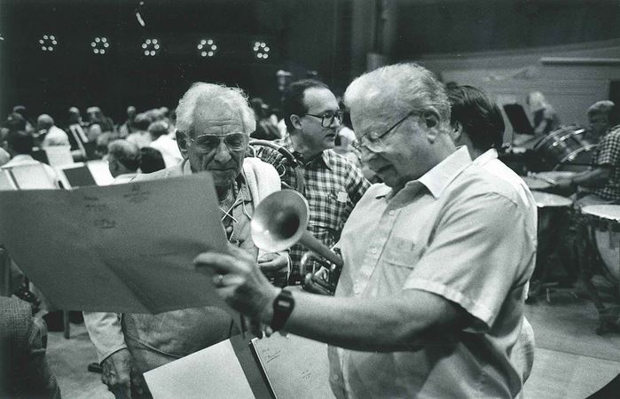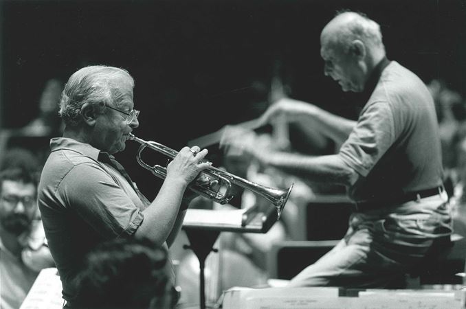 Adolph Herseth and Sir Georg Solti rehearsing Husa's Concerto for Trumpet and Orchestra in Perth, Australia in March 1988