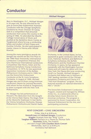 In March 1986, Sir Georg Solti announced the appointment of Kenneth Jean as associate conductor and Michael Morgan as assistant conductor, beginning with the 1986–87 season: “I think we have found two young men with both musical and personal credentials that will be a great asset to the Orchestra in its important community programs.”