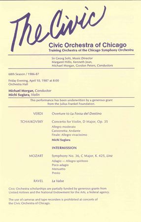 Less than a week after the announcement was made, Morgan joined the Chicago Symphony Orchestra — along with Solti and guest conductor Daniel Barenboim — on tour to Asia. He made his podium debut with the Civic Orchestra on April 10, 1987, leading Verdi’s Overture to La forza del destino, Tchaikovsky’s Violin Concerto with Michi Sugiura, Mozart’s Symphony no. 36 and Ravel’s La valse, and the following month, he made his debut conducting the Chicago Symphony Orchestra on a series of concerts for children.