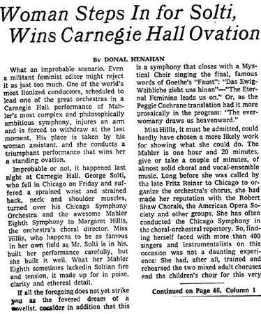 Frazes Hill: After the third performance in Chicago was canceled, Miss Hillis told management, “If I was needed, I will be ready.” At the dress rehearsal in New York, none of us knew who would be conducting that evening. And when she walked out onto the stage, it was pretty clear to all of us that this was going to be on her shoulders. She said, "Please don’t try to help me. Just do your job, and I’ll do mine, and we’ll keep the whole shooting match together." Later, we were onstage for the performance and the gentleman from Carnegie Hall came out and made the announcement that Sir Georg Solti was injured, and the sold-out audience let out a corporate groan. When he announced that in his place would be the conductor of the Chicago Symphony Chorus, he couldn’t even finish her name before the place erupted. We were all so proud, so nervous, there were so many emotions, and we had to come out with a big “Veni!”