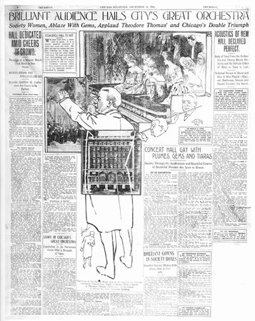 At the beginning of the dedicatory concert on December 14, Thomas led the Orchestra and choruses in “Hail! Bright Abode” from Wagner’s Tannhäuser. George Everett Adams, second president of the Orchestral Association from 1894 until 1899 (and a trustee from 1894 until 1917) and one of the ten men who helped secure the Michigan Avenue property, was given the honor of delivering an inaugural address. “We have built here a noble hall of music. It is a merely material structure of brick, and stone, and steel. We have not, and we cannot, put into this building its living soul. That is a task for other hands than ours.”