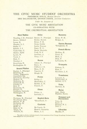 The ensemble made its debut on March 29, 1920, and the roster included several future Chicago Symphony Orchestra members (including concertmaster John Weicher). Frederick Stock, Eric DeLamarter, and George Dasch shared conducting duties, leading Halvorsen’s Triumphal Entry of the Boyards, Godard’s Adagio pathétique, Tchaikovsky’s Fifth Symphony, Grieg’s Suite no. 1 from Peer Gynt, Keller’s Souvenir and Valse and one of Elgar’s Pomp and Circumstance marches.