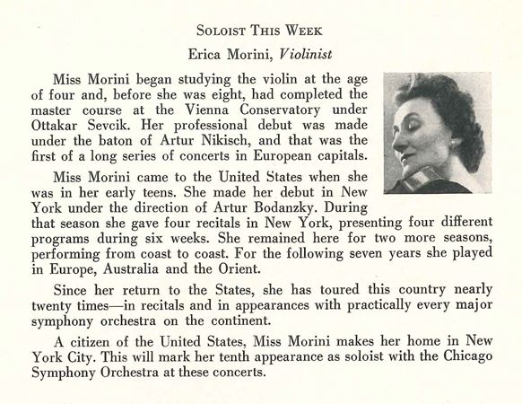 A complete list of Morini’s performances with the Chicago Symphony Orchestra is below: