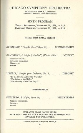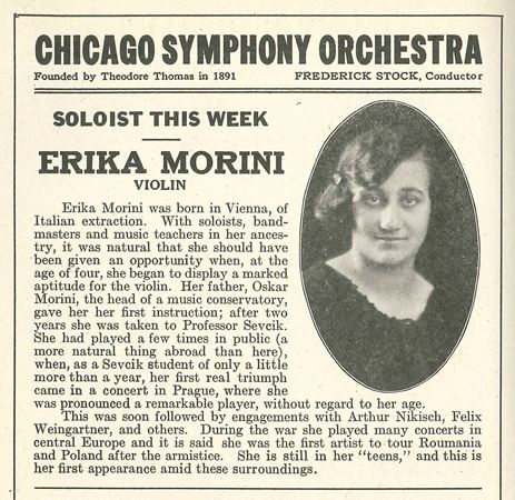 On November 18, 1921, seventeen-year-old Erica Morini made her debut with the Chicago Symphony Orchestra in Vieuxtemps’s First Violin Concerto with second music director Frederick Stock on the podium. “Good violinists, as all concert attendants know, are common enough these days, and most of them are young,” wrote Edward Moore in the Chicago Tribune. "Miss Morini, however, has a few things in her artistic makeup that take her widely out of even their class. It is not once in twenty times that one hears a violinist with the fiery vitality of this young girl. . . . She gave rise to more violinistic fireworks at higher speed and got more of them correct than any one who has been on the stage since the day that Jascha Heifetz took away the breath of the same audience a few years ago."