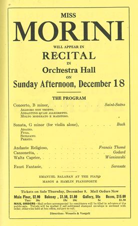 One month later, Morini gave her debut recital in Orchestra Hall. In the Chicago Evening Post, Karleton Hackett wrote, “there was no doubt of the remarkable powers as well as the charm of this young artist. The tone was lovely in quality, the technique of extraordinary accuracy, and everything was done with gratifying ease. . . . Miss Morini has something to say with her violin and the power to say it.”