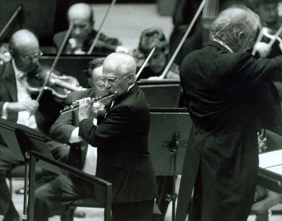 On April 18, 1985, Solti led the Orchestra in the world premiere of Morton Gould’s Flute Concerto, commissioned for Peck. In a preview article in the Chicago Tribune, John von Rhein described his playing as, "Lustrous and penetrating, tender and lyrical, charming and sensual, its hues would put a chameleon to shame. It is one of the most distinctive voices in the orchestral choir, blending well with any ensemble even as it serves a key role within the woodwind section. . . . as principal flutist of the Chicago Symphony Orchestra, Peck has carried out that role with a combination of technical skill and musical understanding that has earned him widespread admiration. Within the fraternity of the flute he is considered to be without peer. No less a judge than Julius Baker, the longtime principal flutist of the New York Philharmonic [and principal flute of the Chicago Symphony Orchestra from 1951 until 1953], pronounces Peck ’the greatest flutist I’ve ever heard.’"