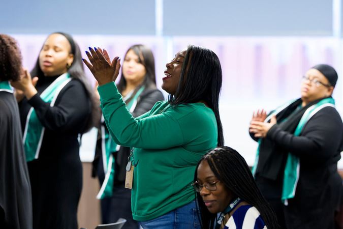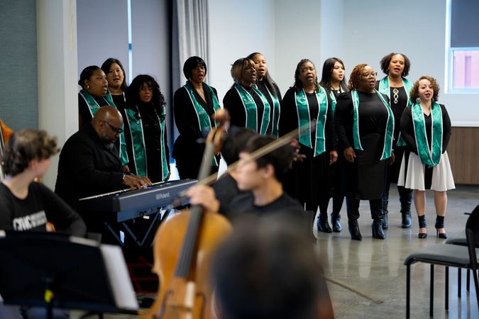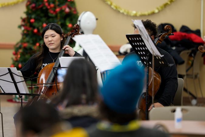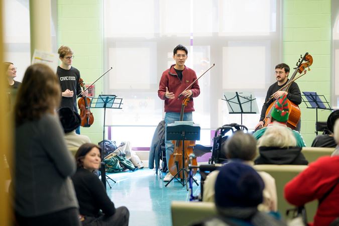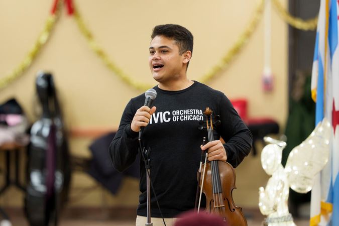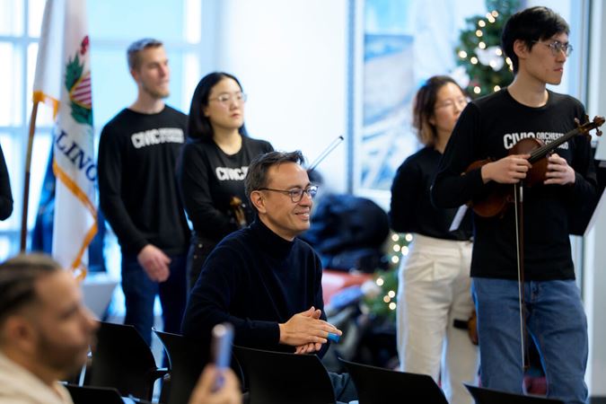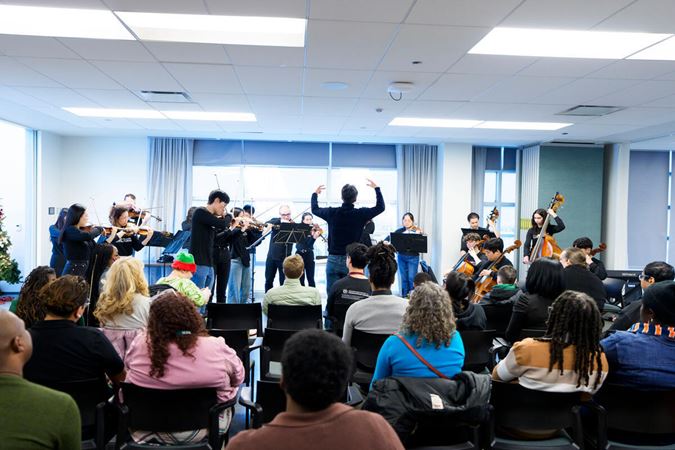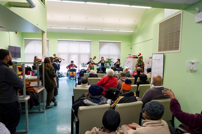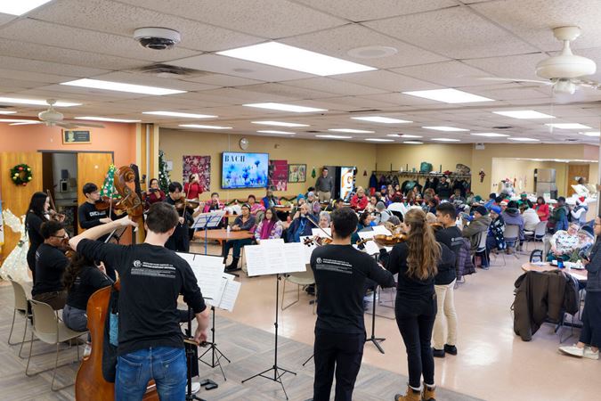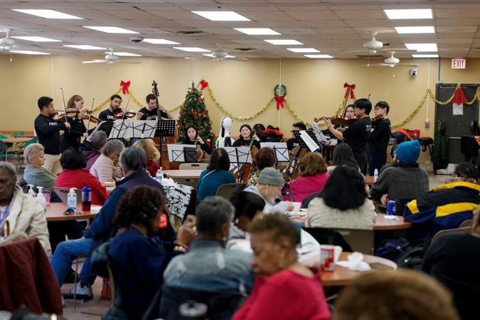 On December 15, Civic musicians travelled to perform at 10 community partner sites in Chicago neighborhoods on the South, West, and North sides of the city, before coming together for a grand finale concert that evening at Fourth Presbyterian Church. Each of the five performing ensembles visited two organizations, for a total of 58 musicians and Civic Principal Conductor Ken-David Masur sharing the inspiring and joyful music of J.S. Bach. Their performances, featuring Bach’s beloved Brandenburg concertos Nos. 3-6, as well as a string orchestra playing Bach’s O Mensch, bewein dein Sünde groß, were shared with more than 350 community members at organizations supporting seniors, people experiencing homelessness and individuals with disabilities.