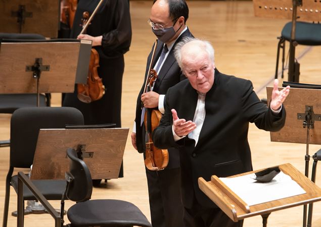 As the concert ends, Edo de Waart gestures in appreciation to members of the Chicago Symphony Orchestra.