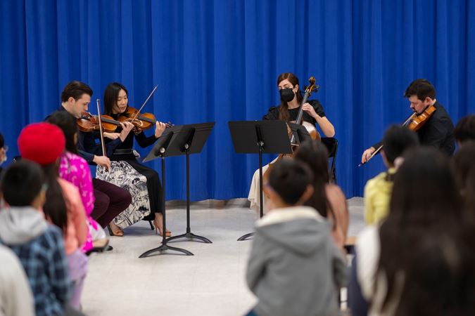 A CSO string quartet performs for students during the 2023 North American Tour.