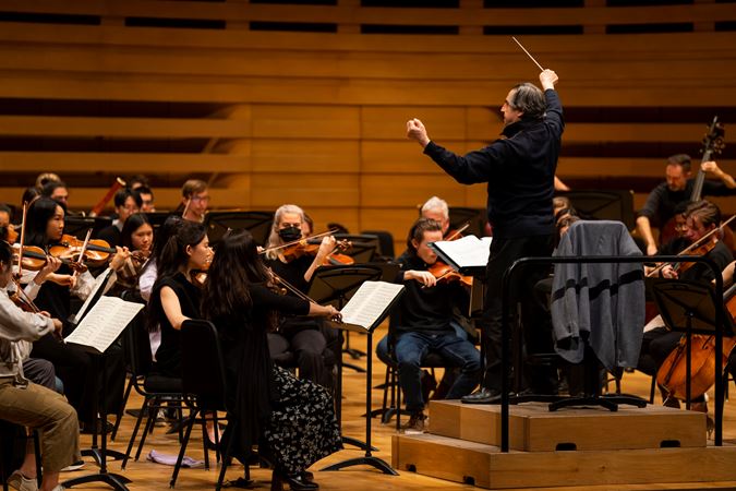 Riccardo Muti leads a daytime rehearsal with musicians from the Glenn Gould School Orchestra at the Royal Conservatory of Music's Koerner Hall during the 2023 North American Tour.