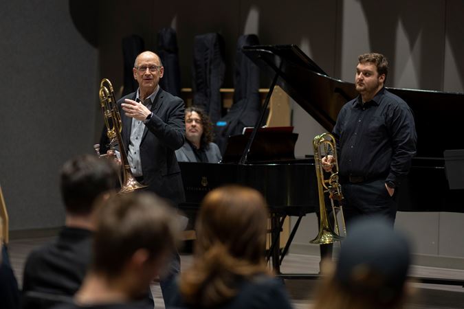 CSO Trombonist Michael Mulcahy leads a master class, arranged by the CSO's Negaunee Music Institute, with the trombone studio at the Michael and Anne Greenwood School of Music at Oklahoma State University during the 2023 North American Tour.