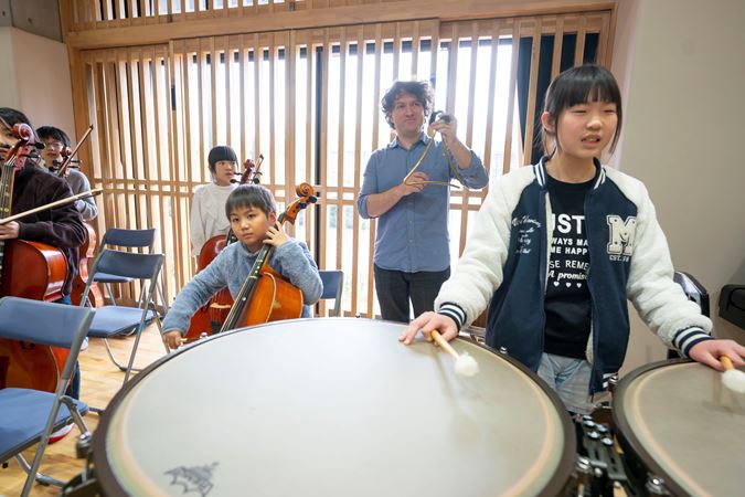 Assistant Principal Timpani and Percussion Vadim Karpinos plays with a youth ensemble on tour in Asia in 2019.