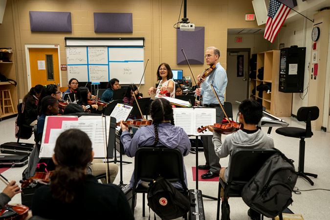CSO violinists Mihaela Ionescu and Russell Hershow lead a sectional on tour in Florida in 2020.