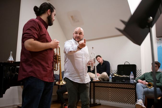 Principal Trumpet Esteban Batallán gives a master class for students during the orchestra's 2020 European Tour.